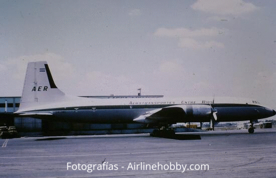 * cn. 4801 Lockheed L-1049H - VH-EAM Qantas “Southern Spray” 13Oct56, N7776C Air New Mex Inc. 24Jul62, Intercontinental US. Inc. Ene63 li, Alaska Airlines 23Abr64 li, International Aerodyne Inc. May67, LV-PJU Aero Transportes Entre Ríos Jun68, LV-JHF rr 23Ago68, N7776C International Aerodyne Dic68, CP-797 Bolivian Airways “Carmen” Dic68 li, N7776C International Aerodyne 10Ene69, Air Cargo Operations Inc. 06Mar69, Leasing Consultants Inc. 05Jun69, L. & H. International Airmotive 26Ene71, Century Airfreight 23Feb73, desprogramado, desmantelado. -ver Los Connies Bolivianos y una identidad compartida-.* cn. 4808 Lockheed L-1049H - N1010C Seaboard & Western Airlines “Munich Airtrader” 18Feb57, Eastern Air Lines 18Feb57 li, Seaboard & Western Airlines 1957, CS-TLD Transportes Aéreos Portugueses Jun58, N1010C Seaboard & Western Airlines Jun59, Seaboard World Airlines nn. Abr61, Canadair Ltd. 1962, Capitol Airways Mar62 li, Canadair May64, YV-C-LBI LEBCA May65, cancelado 14Jun68 radiado del servicio almacenado Miami. Fl. International Aerodyne Jun68, LV-JIO Aero Transportes Entre Ríos Oct68, (Obs. Miami 19Oct70 en operaciones), International Aerodyne May71 desactivado almacenado Miami May71, desmantelado 1972.* cn. 4807 Lockheed L-1049H - N1009C Seaboard & Western Airlines “Shannon Airtrader” 13Feb57, Eastern Air Lines 13Feb57 li, Seaboard & Western Airlines 06May57, Aerlinte Eireann “St. Patrick/Padraig” Abr58 li, Seaboard & Western Airlines Dic60, Seaboard World Airlines nn. Abr61, Intercontinental US Inc. Jun62 li, Trans State Airlines Nov63 li, Seaboard World Airlines Ene64, YV-C-LBP LEBCA May65, canx 11Jun68 radiado del servicio almacenado Miami. Fl, International Aerodyne Ene69, LV-PKW Aero Transportes Entre Ríos Oct68, rr LV-JJO 19Feb69, International Aerodyne Oct70 desactivado almacenado en Miami Oct70, desmantelado 1973.* cn. 13230 Bristol Britannia 312 FF. 05May57 - G-AOVB BOAC 10Sep57, British Eagle International Airlines 15Oct63 li, "Resolution", rn. “Endeavour”, convertido 312F, BOAC Nov68, LV-PHJ (Partió desde Miami 15Oct69) Aerotransportes Entre Ríos 09Oct69, LV-JNL rr 15Oct69 Se estrelló en Ezeiza 12Jul70.* cn. 5 Canadair CC106 (CL44-D4-6) FF. 25Mar61 - 15925 RCAF 23May61, Canadian Armed Forces 01Feb68, 106925 Canadian Armed Forces 26May70, International Aerodyne Inc. 13Nov70, LV-PQL / (1835) Nov70, Aero Transportes Entre Ríos rr LV-JSY 13Nov70. (Realizó un aterrizaje forzoso en Ezeiza recibiendo algunos daños el 27May72). Se estrelló el 25Sep75 despegando de Miami, FL. EE.UU.